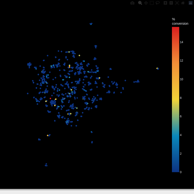 To add layers to these semantic maps, you need to attach additional data to each content unit, such as conversion data. With conversion data, for example, you can associate each point with a color or size representing, for example, a sales volume, a turnover or a conversion rate.